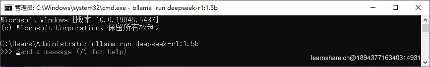 如果关闭了终端,再次进来,还是同样的,打开cmd终端,输入 ollama run deepseek-r1:1.5b 按 Enter 就打开了。